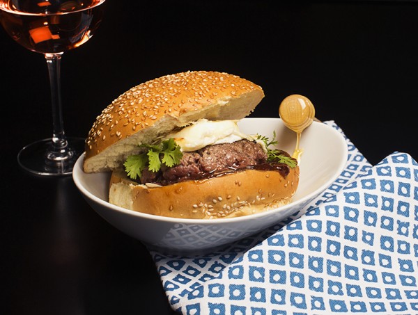 Buns boulanger, steak haché maison, crottin de chèvre, bleu, miel, amandes grillées, confit de figues, roquette)