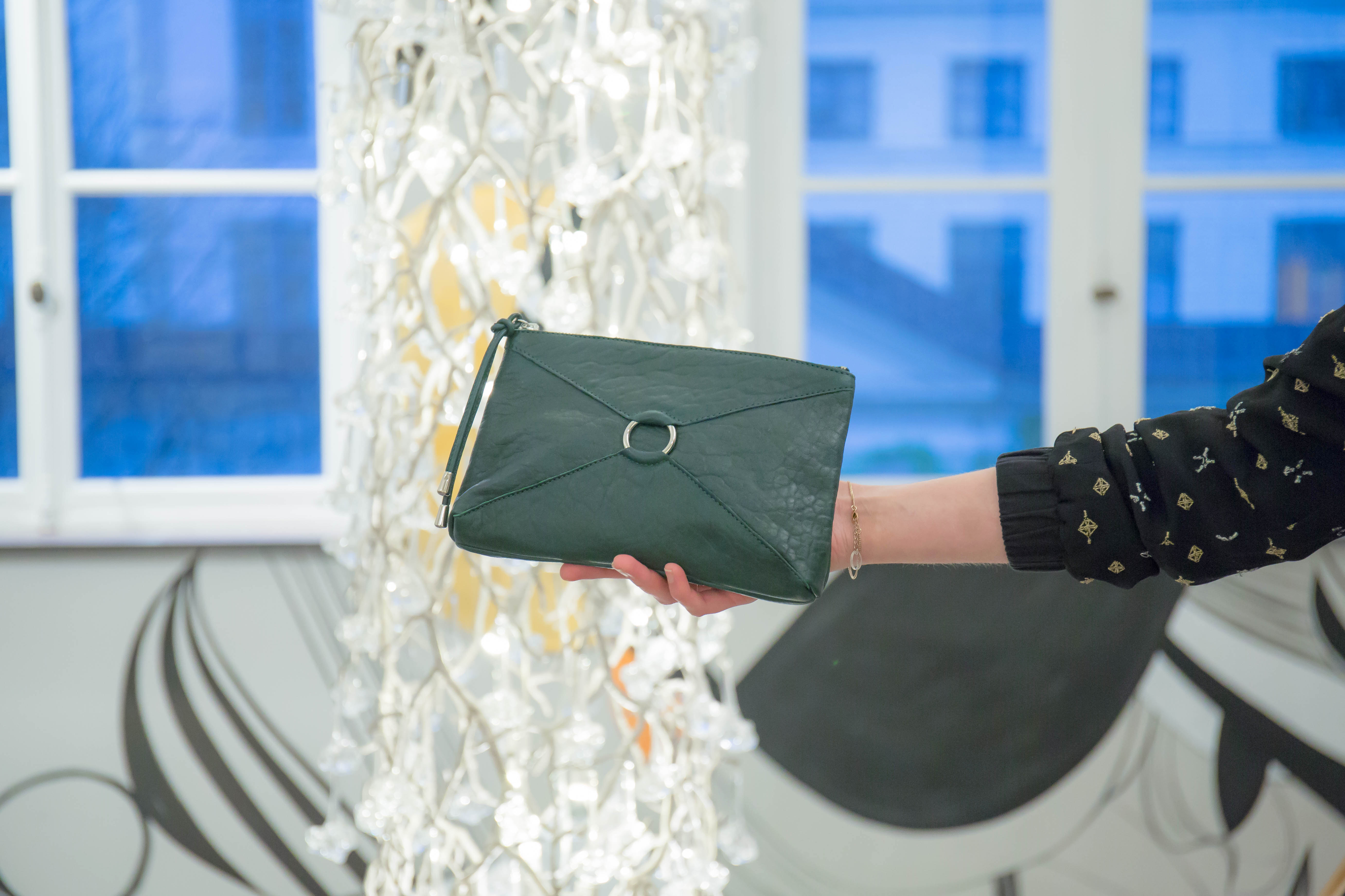 J’ai jeté mon dévolu sur cette pochette vert sapin, ma couleur fétiche du moment ! Elle m’accompagne le jour glissée dans mon sac et le soir venu se transforme en pochette chic.